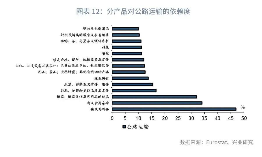 从公路运输来看, 公路运输有机动灵活但运量小的特征。2020年,我国对欧盟出口的公路运输依赖度为9.3%。其中,约有46.9%的镍及其制品出口选择公路运输,随后依次为肉及食用杂碎,烟草、烟草及烟草代用品的制品,鞋靴、护腿和类似品及其零件,武器、弹药及其零件、附件,糖及糖食等产品,参见图表12。