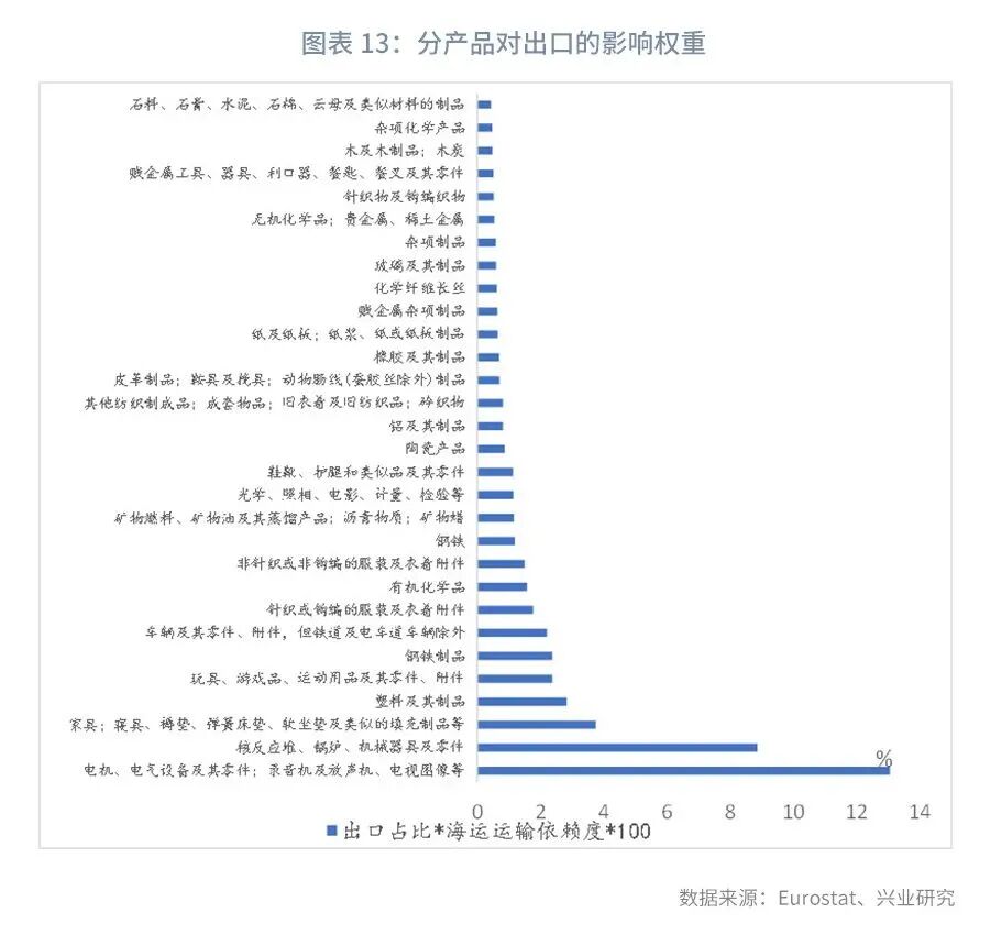 进一步地,本文结合各行业出口占我国出口比重与对海运运输依赖度,测算哪些行业在运费上涨压力下对我国出口拖累权重。结果显示,影响权重位居前列的产品主要有: