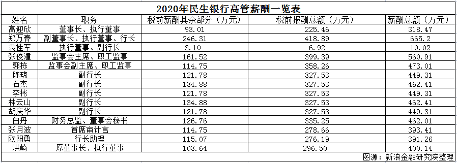 据民生银行2020年报此前披露的数据,自高迎欣2020年度领取的税前报酬总额为225.46万元,郑万春则为418.89万元。如果加上此次披露的其余部分,那么高迎欣2020年领取税前报酬总计318.47万元,郑万春则为665.2万元,而据计算可知,此次披露的14名高管2020年平均薪资约为424.79万元。