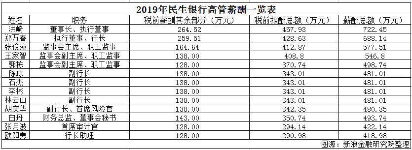 据2019年报和补充公告,民生银行原董事长洪崎薪酬总计约为723万,行长郑万春约为689万。该行13位高管平均薪酬约为520.99万元。