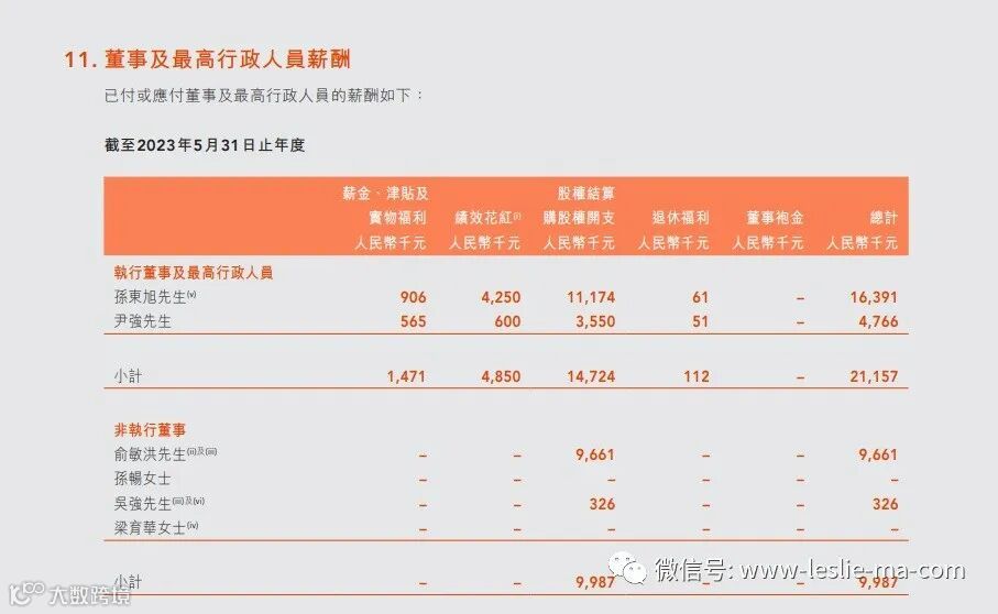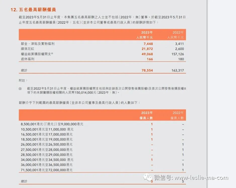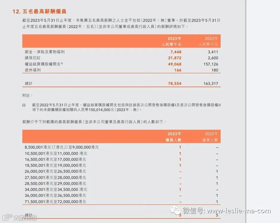可以看到,最高收入的五名雇员里面,最高的是拿到了三千四百多万港币的(大概3150万人民币,包括了购股权部分),最低的也是850万人民币到9百万人民币之间。如果大概算一下现金部分的话(薪金、津贴和实物福利加上绩效花红),五名收入最高的雇员里面,人均每年拿走小600万人民币的样子,购股权部分大概5000万人民币,五名雇员,按照人均算的话,平均都得1000万人民币。这部分大概是每年归属1/3可行权,三年拿走。