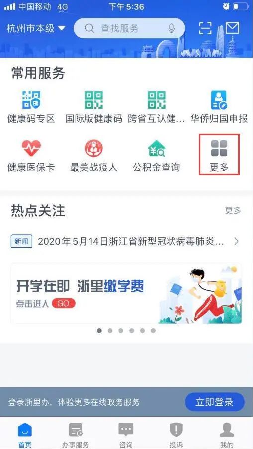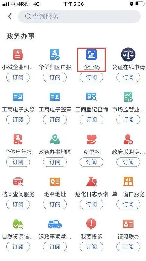 在「浙里办」APP首页,在常用服务中点击「更多」,下拉到「政务办事」中,即可找到「企业码」应用。