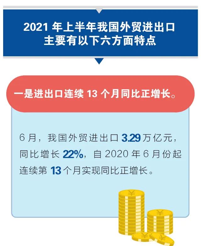 进出口连续13个月同比正增长。2021年6月,我国外贸进出口3.29万亿元,同比增长22%,自2020年6月份起连续第13个月实现同比正增长。