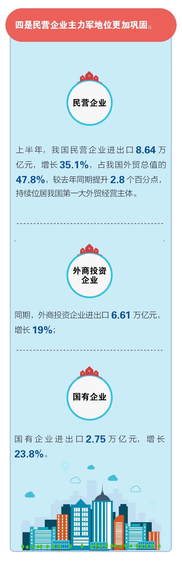 民营企业主力军地位更加巩固。上半年,我国民营企业进出口8.64万亿元,增长35.1%,占我国外贸总值的47.8%,较去年同期提升2.8个百分点,持续位居我国第一大外贸经营主体。同期,外商投资企业进出口6.61万亿元,增长19%;国有企业进出口2.75万亿元,增长23.8%。