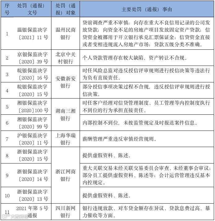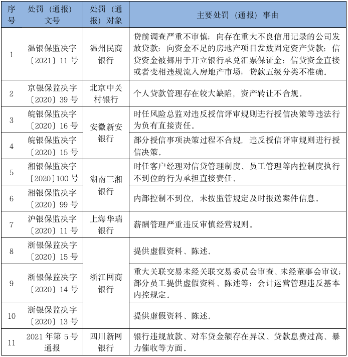 2020年到2021年一季度,民营银行合规经营情况总体可控,没有发生有重大影响的案事件,但监管处罚明显增加,共有7家机构收到10张罚单和1个通报,而2019年只有3家机构收到5张罚单。10张罚单主要针对浙江网商银行(3张),湖南三湘银行和安徽新安银行(各2张),上海华瑞银行、北京中关村银行和温州民商银行(各1张);1个通报主要针对四川新网银行。处罚和通报案由集中在信贷业务、内控管理和消费者权益保护等方面。