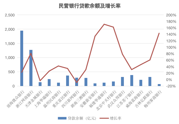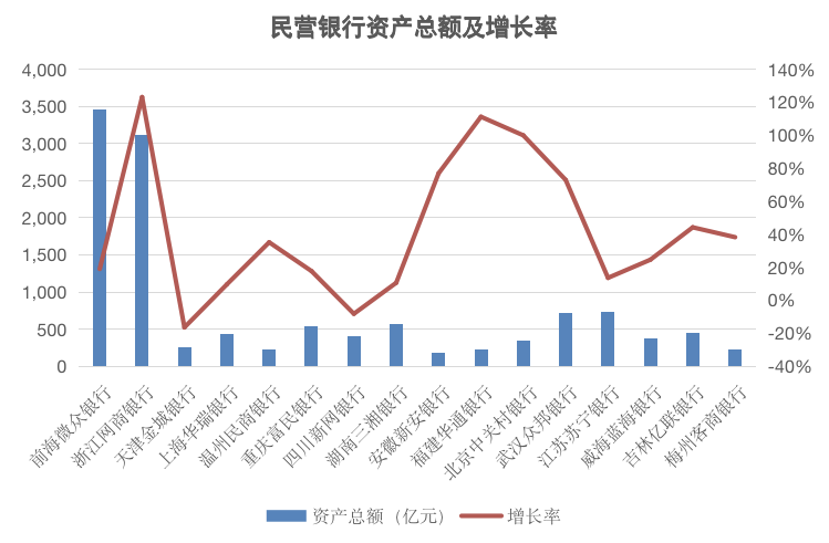 1.资产规模高速扩张。截至2020年末,16家民营银行资产总额12275亿元,较上年末增加3458亿元,增幅达到39%,虽然较去年有所放缓,但仍是全国银行业平均资产增幅的近4倍。其中浙江网商银行、福建华通银行、北京中关村银行资产增幅超过1倍,分别达到123%、111%和100%;安徽新安银行、武汉众邦银行资产增幅超过50%,分别达到77%、73%。低于全国银行业平均资产增幅的民营银行仅有3家,分别是上海华瑞银行、四川新网银行和天津金城银行,增幅分别为9.60%、-8%和-16%。