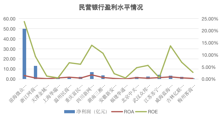 1.净利润逆势上涨。2020年,民营银行共实现净利润95亿元,较上年增加14亿元,增幅达到17%,虽然远低于自身业务规模增长,但这一成绩在去年疫情的特殊情况下,仍远远高于同业平均水平;同期,全国商业银行净利润下降近3个百分点,城商行净利润更是下降近15个百分点。其中前海微众银行净利润50亿元,占全部民营银行净利润的一半以上;排名第二的浙江网商银行,资产总额虽接近前者,但净利润只有13亿元,只有前者三分之一;其他民营银行净利润大多在2-4亿元左右。民营银行净利润的逆势上涨,一方面来自于贷款业务的大幅增长,另一方面得益于较高的利率定价水平和净息差,其2020净息差年为3.67%,超过全国银行业平均水平1.57个百分点,超过全国城商行平均水平1.67个百分点。