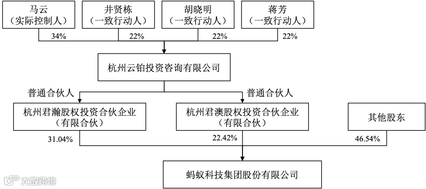 说明:杭州君瀚及杭州君澳合计持有蚂蚁集团53.46%的股份。杭州云铂投资咨询有限公司(以下简称“云铂投资”)为杭州君瀚及杭州君澳的普通合伙人,不享有任何来源于蚂蚁集团的经济利益。马云先生、井贤栋先生、胡晓明先生及蒋芳女士分别持有云铂投资34%、22%、22%及22%的股权,根据云铂投资现行章程及《一致行动协议》,马云先生能够实际支配云铂投资股东会与行使蚂蚁集团股东权利相关事项的表决结果,进而通过云铂投资控制的杭州君瀚及杭州君澳间接控制蚂蚁集团53.46%股份的表决权。因此,本次调整前,马云先生为蚂蚁集团实际控制人。