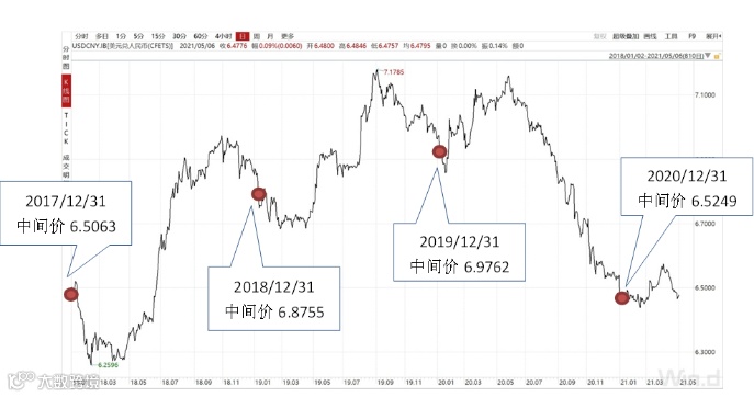 上图是2018年1月至今USD/CNY汇率走势图,2018/1/1 USD/CNY开盘价6.4952,随后经历了2018-2019年贸易战引发的人民币大幅贬值,以及2020年全球疫情影响下人民币的快速升值,2021/1/4 USD/CNY开盘价6.5195,时隔三年美元汇率重回6.5附近震荡,这背后体现了汇率波动底层的周期属性。