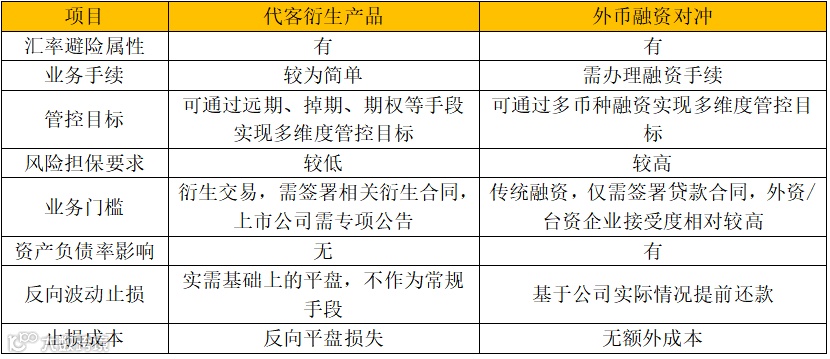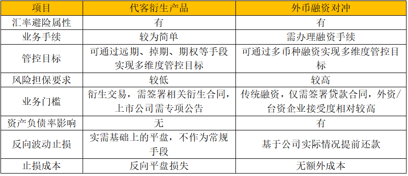 尽管机理不同,在汇率避险方面,外币融资可以发挥同代客衍生产品类似的作用,但在细节上两者还是有较大差异,各有利弊,在此笔者简单整理了两者之间的部分异同点及优劣势作简要分析: