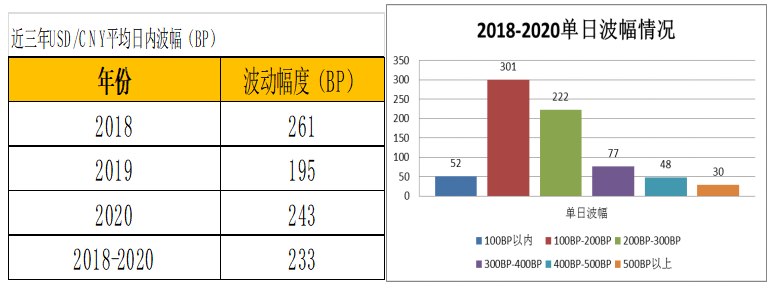 假定公司4/26需要对外支付100万美元,当天即期购汇价格6.49,需要649万元人民币,但如果这一天我们为企业办理一笔100万美元的外币贷款垫付,企业在随后一周内等待汇率波动100BP,则可以648万人民币购汇归还该100万美元,本金节约1万元,考虑到融资有利息成本,企业的盈亏平衡利率为:1/649*360/7=7.9%²,仅需融资利率低于7.9%上述操作公司就有盈利。至于一周内等待汇率波动100BP的目标,2018年至2020年三年间,USD/CNY每天的平均波动幅度就超过了200BP,在美元横盘甚至震荡下行的过程中,一周内等待汇率波动100BP的机会是非常大。