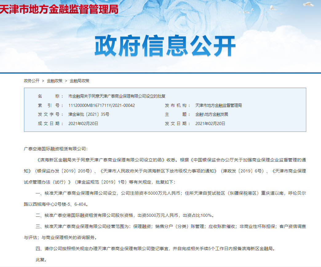 2月20日,天津市地方金融监督管理局发布公告,核准天津广泰商业保理有限公司设立,公司注册资本5000万元人民币!核准广泰空港国际融资租赁有限公司股东资格,出资5000万元人民币,出资占比100%。