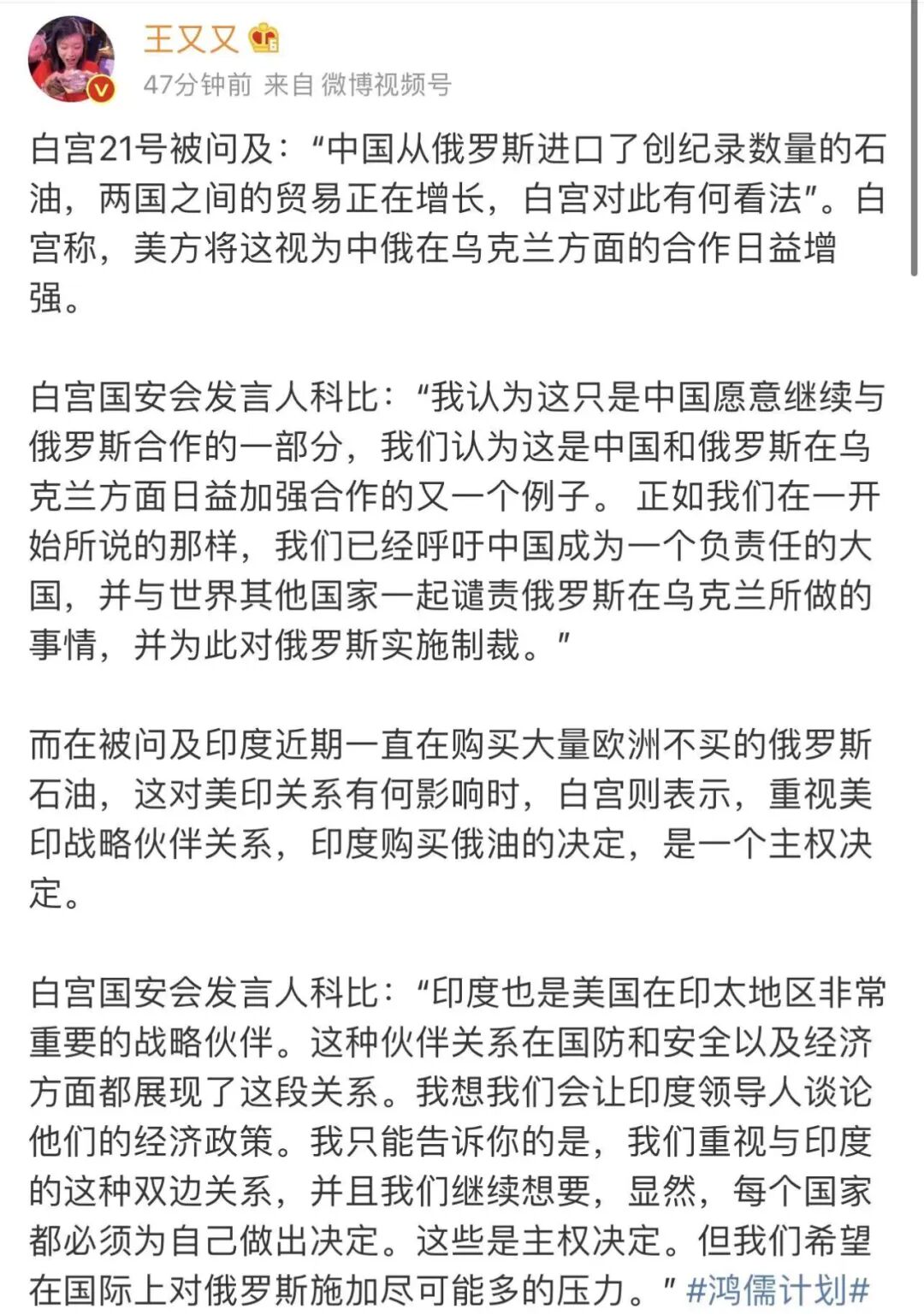Q Hey, John. Thanks, Karine. John, the Chinese have imported a record amount of oil from Russia, and the trade between the two countries is growing. What message do you have to the Chinese related to this?