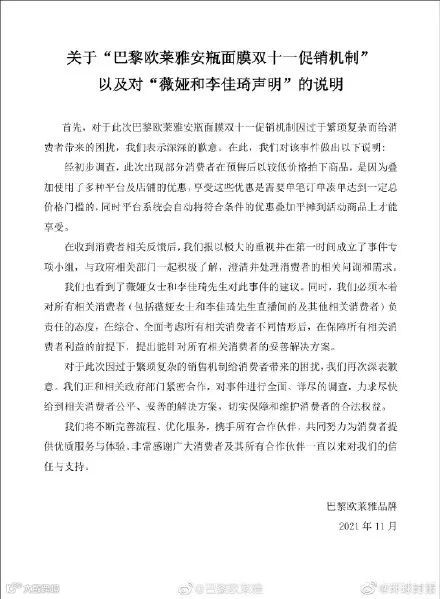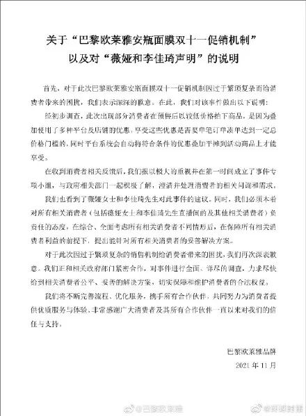 第一,主播该承担责任承担责任。在头部主播直播间买东西的网友,如果薇娅和李佳琦有承诺最低,那没有最低就该头部主播给大家补。然后薇娅和李佳琦和欧莱雅之间是如何约定的,大家管不着,薇娅和李佳琦给大家补完之后,头部主播再去找欧莱雅算账。你这出来发个声明,就把事儿推给欧莱雅了,这也不合适,辜负大家对头部主播的信任。欧莱雅这个事儿出来之后发了个声明更神,说了半天也没把事儿说清楚,你和薇娅和李佳琦怎么约定的?如果没有最低价给,怎么处理?你的那个最低价如何来的,大家不关心,也和买货的网友木有关系。