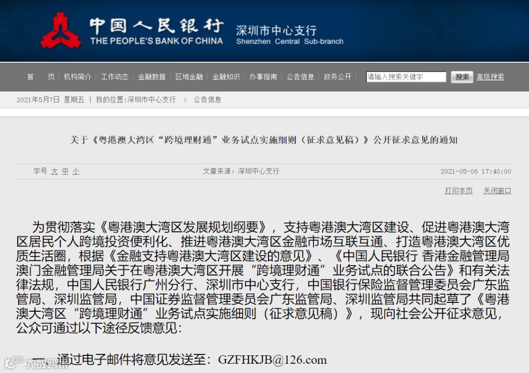 5月6日,由中国人民银行广州分行、深圳市中心支行,中国银行保险监督管理委员会广东监管局、深圳监管局,中国证券监督管理委员会广东监管局、深圳监管局共同起草的《粤港澳大湾区“跨境理财通”业务试点实施细则(征求意见稿)》,正式向社会公开征求意见,意见反馈截止时间为2021年5月21日。标志着大湾区投资者热切期盼的“跨境理财通”即将尘埃落定,有望在今年正式与大湾区投资者见面。