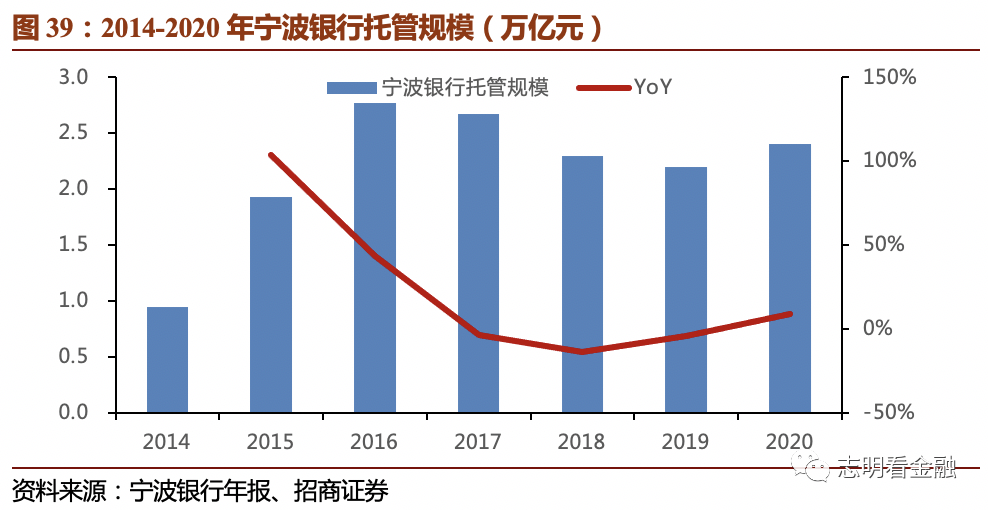 宁波银行托管系统解决客户痛点,具备一定的行业竞争力。宁波银行托管系统“易托管” 解决了客户开户麻烦/投后管理难/资管系统与托管系统无法直联等痛点,具有一定竞争力。以银行理财为例,宁波银行推出易托管系统银行客户版,上线母户管理/子户线上开户/个性化报表/投后管理等多个银行客户专属功能模块,继续扩大理财托管优势。据宁波银行官网披露,2020年宁波银行凭借高效的服务,陆续营销了近五十家无托管资质的城农商行理财托管,实现沿海地区/中西部及东北部发达省会城市全覆盖,2020年理财托管规模增长了2536亿元。