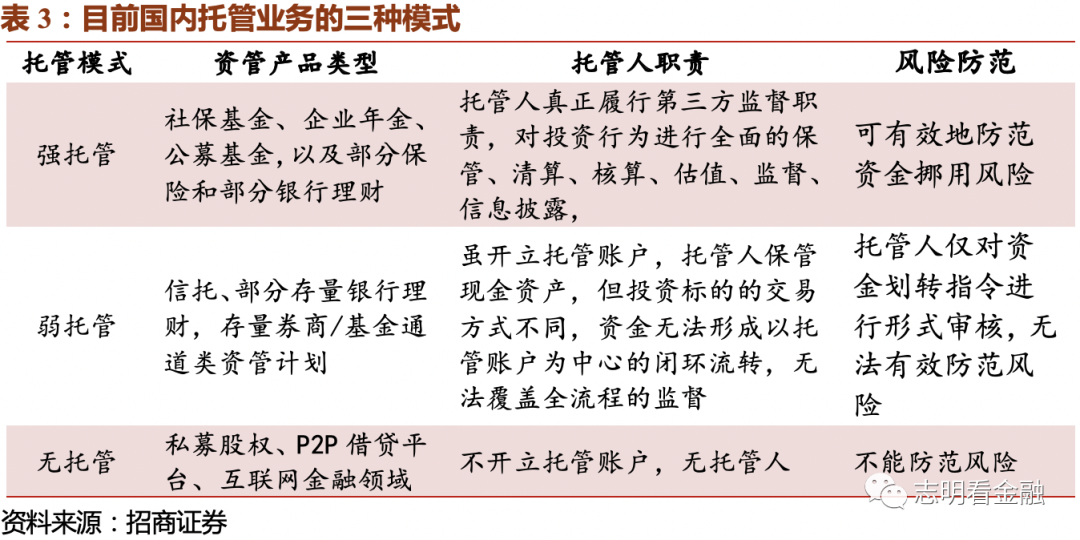 目前国内仅部分资管产品有相应法律法规如证券投资基金领域颁布的《证券投资基金托管业务管理办法》、银行理财领域颁布的《商业银行理财业务监督管理办法》等对托管人提出明确要求,但对于单一信托计划、互联网金融领域托管业务并无明确的约定托管人权利与义务的相关法律法规或行业自律规范制度,此类产品仍处于“无托管”、“弱托管”状态。“无托管”、“弱托管”领域缺失托管人独立第三方监督机制,导致风险事件频发。预计未来随着“资管新规”相关配套政策的不断推进,各类资管产品将从“无托管”走向“弱托管”,“弱托管”走向“强托管”。