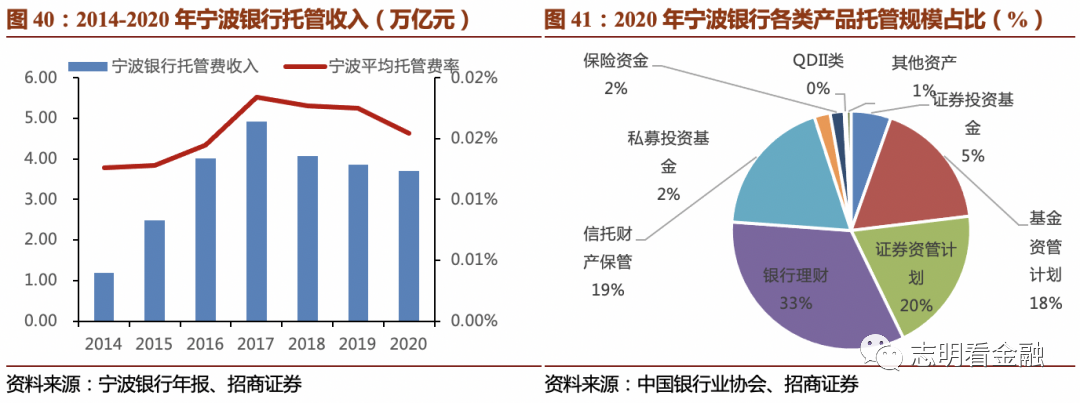 2020年宁波银行平均托管费率为0.016%,仅为行业平均水平0.031%的一半。我们判断主要由于宁波银行采取低费率的营销策略,也导致宁波银行托管结构中,银行理财/信托计划(更关注费率)占比较高,分别达33%/19%。