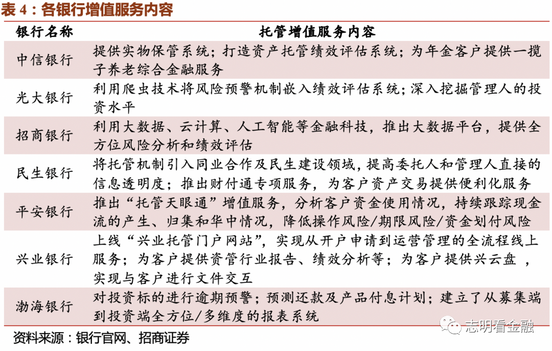 我们认为,工行为大行托管业务的龙头,招行为股份行标杆,宁波银行为城商行的标杆,未来发展向好。