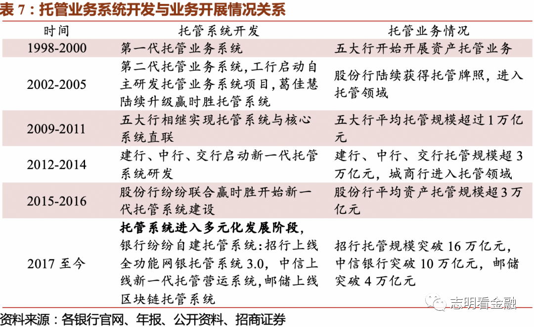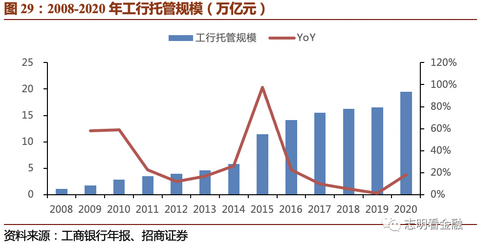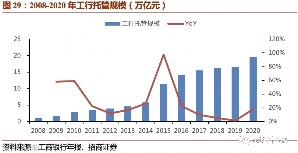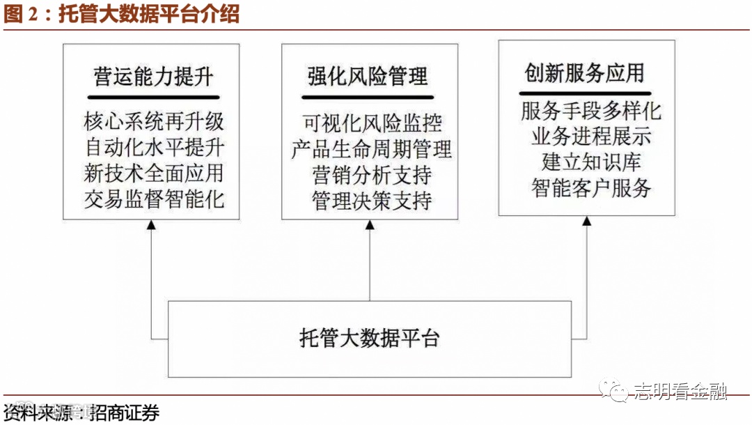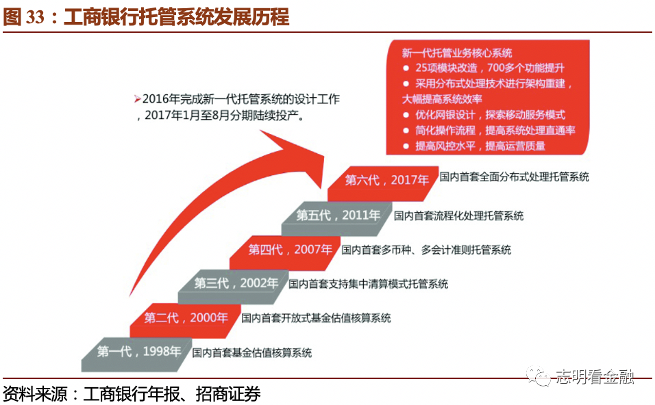 搭建智慧托管系统,实现托管服务外延。工商银行是国内首家自主研发托管系统的银行,先后自行研发并投产了六代托管业务综合系统,满足了客户个性化的需求并推动了托管业务的发展。目前,工行搭建智慧银行托管系统,通过智慧营运后台改造和智慧数据中台建设,提升托管业务受理能力和处理效率;同时,工行拟通过智慧管理平台和智慧投资服务平台建设,增加客户交互平台、大数据平台、服务管理系统等,在托管基础服务上为客户提供宏观趋势、市场分析、投顾服务等增值服务,通过服务外延不断提升托管业务的核心竞争力。