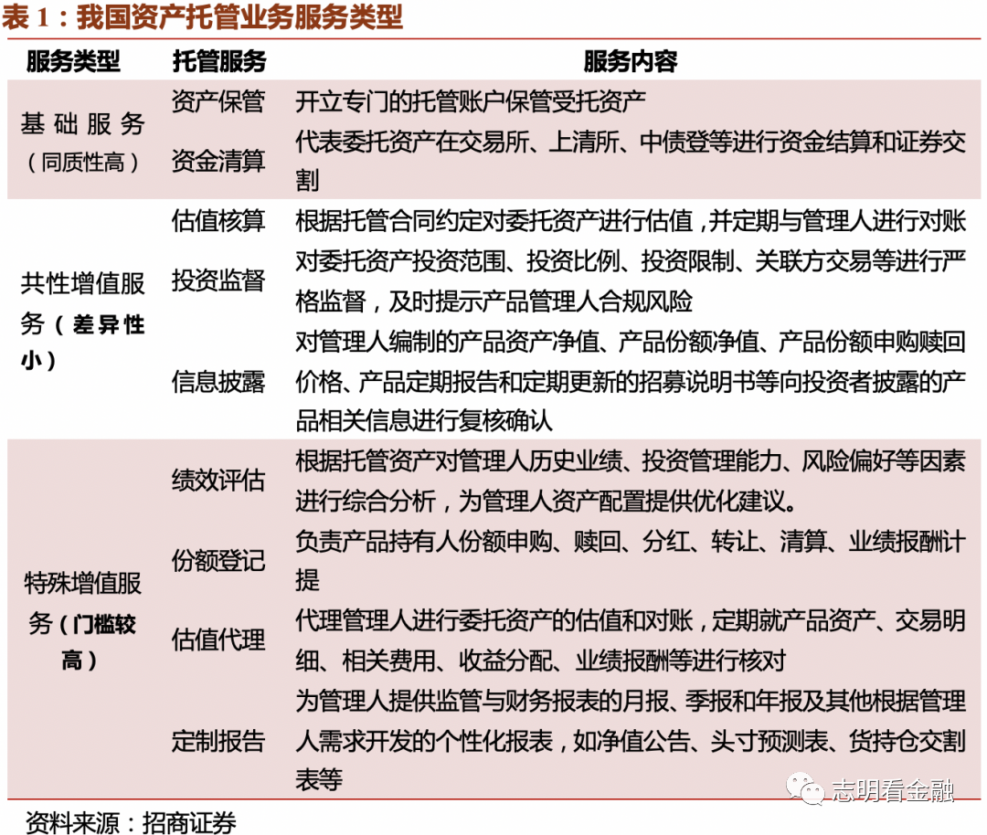 1)托管服务的内容不断丰富,延缓了费率下降的趋势。在托管市场发展初期商业银行只要拥有业务牌照,仅提供资产保管服务就可赚取托管费用。而随着托管业务发展,监管对托管人提出了更高要求,托管银行须丰富托管产品服务内容,包括估值核算、投资监督等。托管行提供的服务品类更丰富,延缓了托管费率下降的趋势。