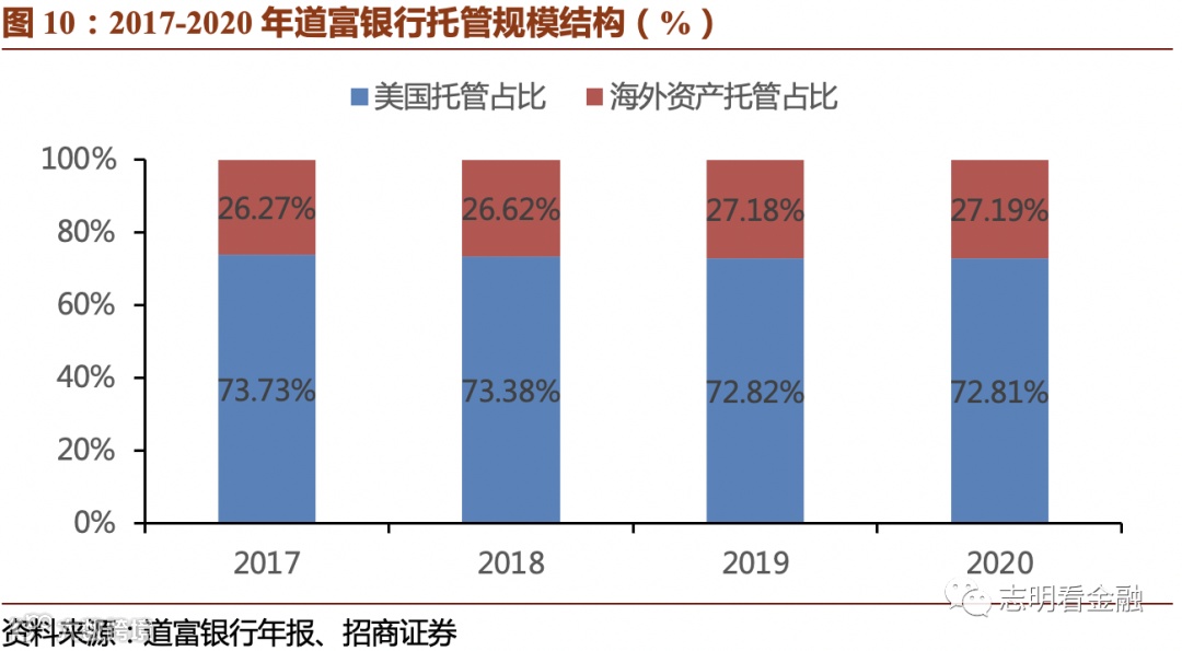 国际托管银行利用先进的系统和优质的服务搭建全球托管业务网络,实现托管业务的全球化。根据道富银行年报,其海外托管规模占比不断提升,2020年道富银行海外托管规模占比达27.19%,海外托管费收入占比达47%,海外托管业务成为道富银行托管业务收入重要部分。