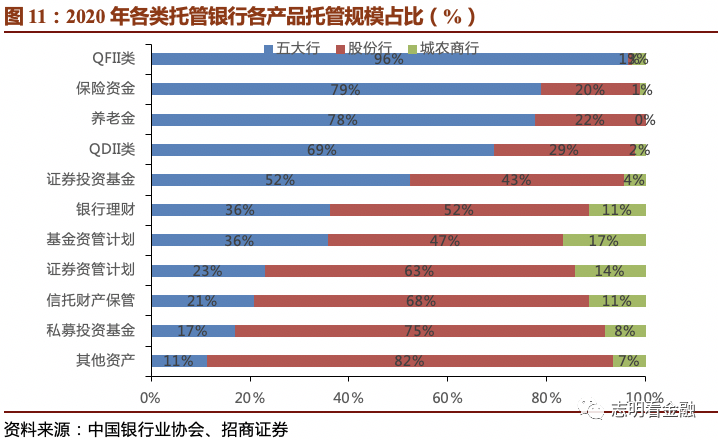 在QFII业务中,大行海外分部多,境外机构客户多,QFII业务获取来源广,因此大型商业银行在QFII托管规模占比中具有绝对优势,截至2020年末达96%。2020年央行宣布取消QFII额度限制,海外机构投资者对国内资产配置需求逐渐上升,我们认为QFII市场会进一步扩大,大行优势也将持续保持。