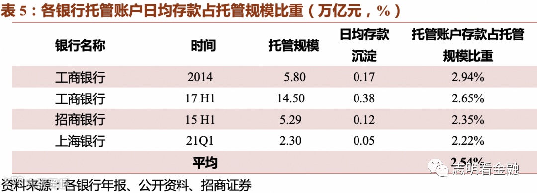 *各银行托管存款的净利息收入=(2020年各银行的生息资产平均收益率-托管账户存款的平均付息率)*各银行托管规模*沉淀存款率。其中,包商银行被建行托管,包商银行生息资产收益率用建行数据。
