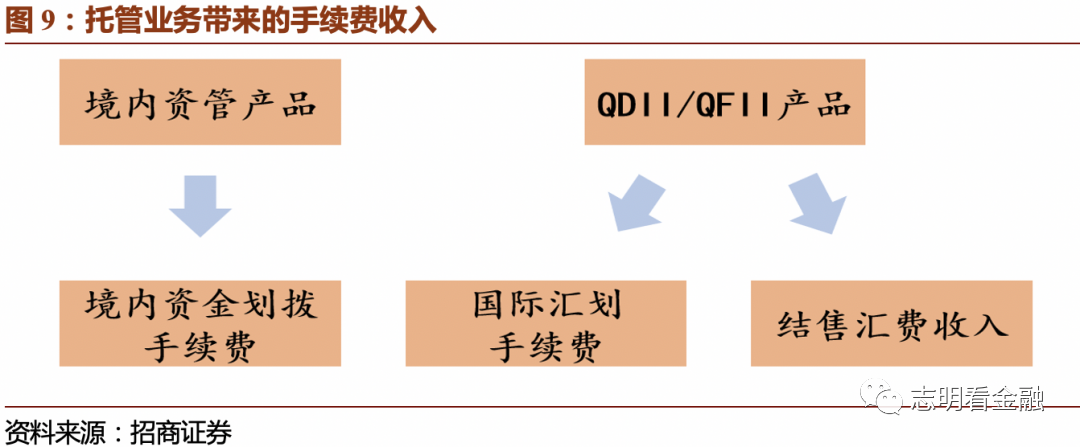 收取汇划费/结售汇等手续费,增厚中收。托管银行在托管受托资产前,需开立专门的托管账户并将受托资产划入托管账户内,然后根据资产管理人的指令进行资金划拨。因此,受托资金的流转在托管账户中进行,而托管银行对每一笔受托资金的划付收取汇划费。此外,一些特殊托管品种如QDII/QFII等产品在跨境划转资金时还涉及到换汇,托管银行可从中收取本外币结售汇费用等。