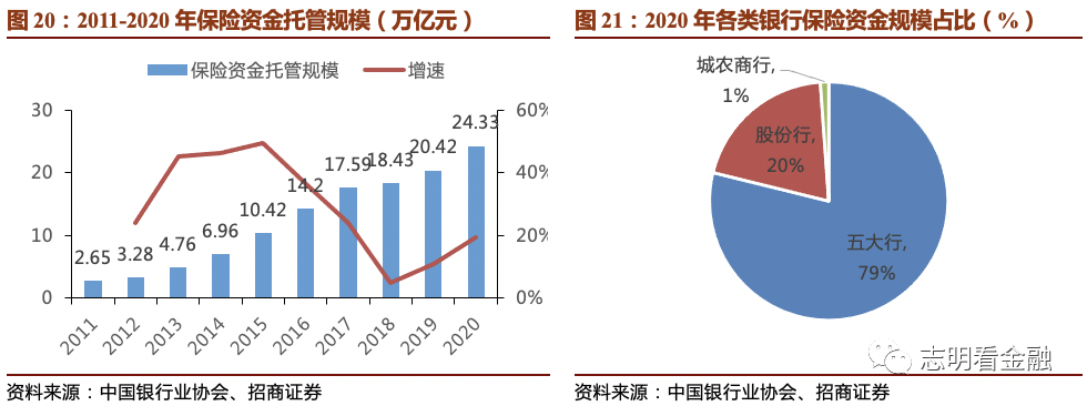 保险资金托管市场中,大型商业银行代销优势和先发优势明显,市占率较高。保险公司通常将保险资金的托管作为商业银行为其代销保险产品的对价。因此,代销资源丰富的五大行在保险资金托管市场中具备优势。此外,由于保险资金分散托管对保险公司来说运营压力较大,保险公司一般会选择继续与原托管银行进行合作,导致了大型商业银行具有明显先发优势。据中国银行业协会,2020年保险资金托管规模达24.33万亿,其中规模排名前五位的分别是工商银行(22.23%)、建设银行(18.76%)、农业银行(18.11%)、中国银行(11.64%)、交通银行(8.11%),CR5为78.85%。