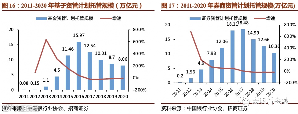 快速增长阶段(2011-2016年):2010-2011年间,银监会相继发布了《中国银监会关于规范银信合作业务有关事项的通知》、《中国银监会关于印发信托公司净资本计算标准有关事项的通知》等文件,切断了银行理财通过银信合作模式投放信贷的路径,催生了双SPV的通道模式,拉开了“大资管”时代的帷幕。在“大资管”时代背景下,资管业务的快速扩张带动了托管业务的发展,托管规模从2011年末的14万亿元迅速增长到2016年末的122万亿,CAGR+54%。在“大资管”时代中,随着影子银行与非标准化债权资产的壮大,托管业务规模高速增长。