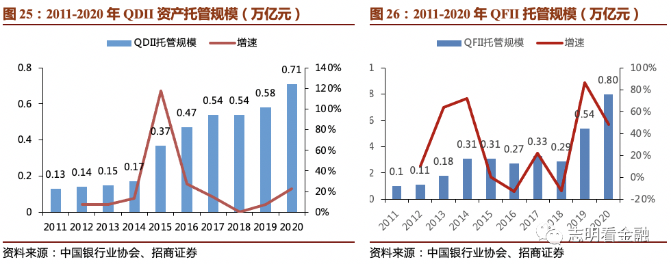 QDII/QFII托管市场增长稳健,有境外托管分部的大行占据优势,未来大行优势将持续保持。受限于额度管控,QDII托管规模增长稳健,根据中国银行业协会,截至2020末,QDII/QFII托管规模达0.71/0.80万亿,YoY+22%/48%。