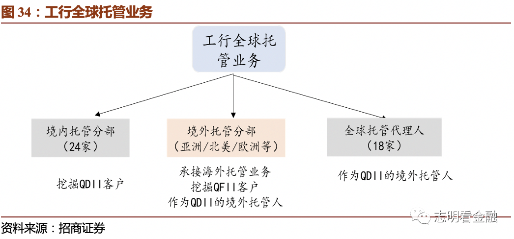 国内银行托管业务国家化进程有望提速。目前国内商业银行已开始布局全球托管业务,其中工商银行/中国银行/建设银行等大型商业银行在香港、欧洲、俄罗斯、阿根廷等全球主要市场已具备一定的托管服务能力;部分股份行与外资托管银行合作,将QDII产品直接委托给外资托管机构进行境外投资。我们判断随着全球化进程的加速,由贸易、投资带动的资本跨境流动进一步催生对跨境资产托管业务的需求,国内银行托管业务全球化进程有望提速。