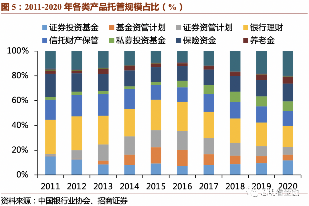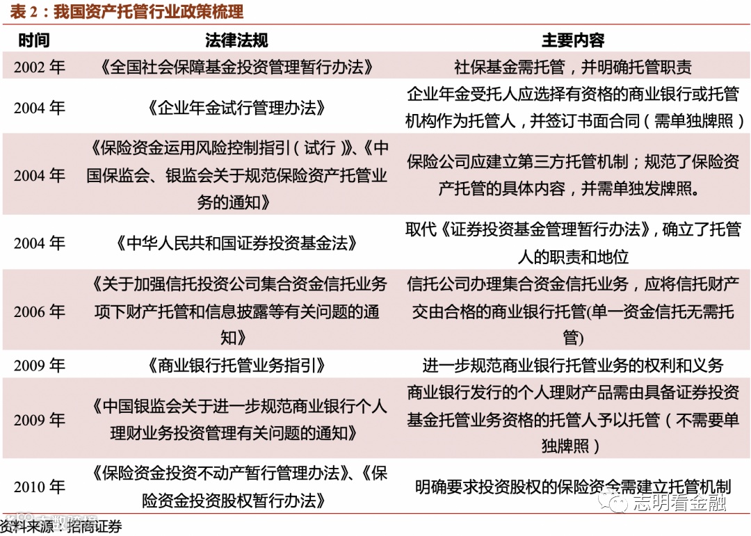 多元发展阶段(2003-2010年):这一阶段,我国资产托管业务的相关法律法规不断完善。2002年《全国社会保障基金投资管理暂行办法》明确了社保基金需要第三方银行进行托管;2004年《中华人民共和国证券投资基金法》,确立了托管人的职责和地位;2009年《商业银行托管业务指引》进一步规范商业银行托管业务的权利和义务。托管业务的品类也不断扩大,从之前证券投资基金拓展到社保基金、QDII、QFII、保险资金、企业年金、券商资管计划、信托计划、商业银行理财等诸多品种。