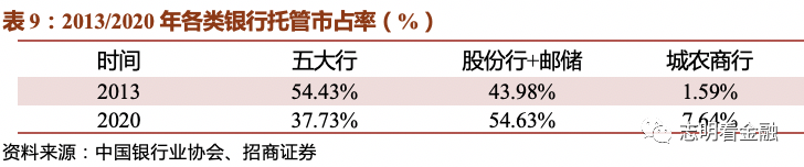 市占率:五大行份额下降,股份行/城农商行份额提升。五大行获得资产托管业务牌照最早,在市场竞争中占有先发优势。2013年五大行托管规模占比54%。但随着托管牌照的逐渐放开,股份行和城农商行逐渐获取托管牌照,市场竞争加剧,五大行托管规模占比逐渐下降,2020年占比37.73%,较2013年下降16.7个百分点。