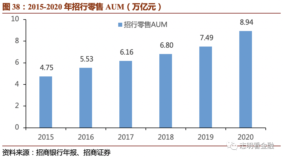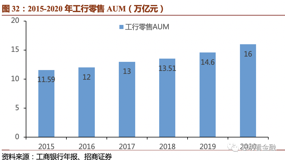 招商银行于2001年获取托管牌照,是首家获得托管牌照的股份行。截至2020年末,招商银行托管规模突破16万亿,规模上仅次于工商银行,位居行业第二。从托管规模增速来看,招行近6年(2014年末-2020年末)CAGR+28.6%,明显快于行业20.9%的水平,我们判断主要由于招行把握住大资管时代发展机遇,在通道业务/专项资金监管上快速发展,随后通道业务受限,招商又迅速调整发展策略,凭借代销能力重点发力主动管理类的资管产品。