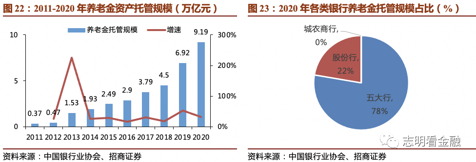 受行业准入限制,养老金托管市场中,大型商业银行享受准入门槛红利。我国企业年金、职业年金、个人储蓄性养老保险市场空间广阔,养老金市场处于快速增长阶段。截至2020年底,养老金托管规模达9.19万亿,同比增长23%。受行业准入限制,国内开展养老金托管业务的银行仅10家,因此,大型国有银行享受准入门槛红利。2020年养老金托管规模排名前五位的分别是交通银行(22.79%)、工商银行(21.36%)、中国银行(13.04%)、建设银行(13.03%)、农业银行(7.46%),占比合计77.69%。