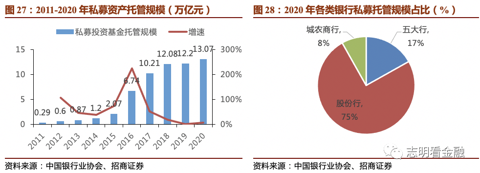 股份行为获取更多存款沉淀,开展私募业务积极性较高,规模占比高,预计未来股份行优势将持续保持。私募投资基金托管业务综合收益高,主要由于私募投资基金会沉淀较多的存款。该存款属于一般性企业存款,是商业银行重要的经营指标之一。但由于投资者可能误认为托管银行对托管的私募产品进行了信用背书,当产品出现兑付危机时托管银行会面临声誉风险,因此大型商业银行在拓展私募托管业务时较为谨慎。而股份行为了获取更多的企业存款沉淀,开展私募业务积极性相对较高,在私募业务中占比也相对较高。随着金融监管的进一步趋严,私募业务发展受一定的限制,同时考虑到声誉风险,私募业务并不是商业银行拓展托管业务发展的主要方向。