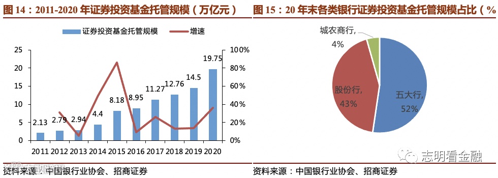 证券投资基金托管一般是“以销定托”,即基金公司在会选择销售能力更强的商业银行作为托管行。大型商业银行网点更多,代销实力显著强于股份行和城农商行,在证券投资基金托管中具有显著的代销优势。而中信银行作为股份行排名靠前,主要由于中信银行在2013年把握市场机会,配合天弘基金和支付宝对托管系统进行开发改造,托管了“天弘余额宝”货币基金。截至2020年末,“天弘余额宝”规模1.2万亿,占证券投资基金总规模的6%。不过,随着股份行等纷纷发力财富管理,这一格局或有变化。