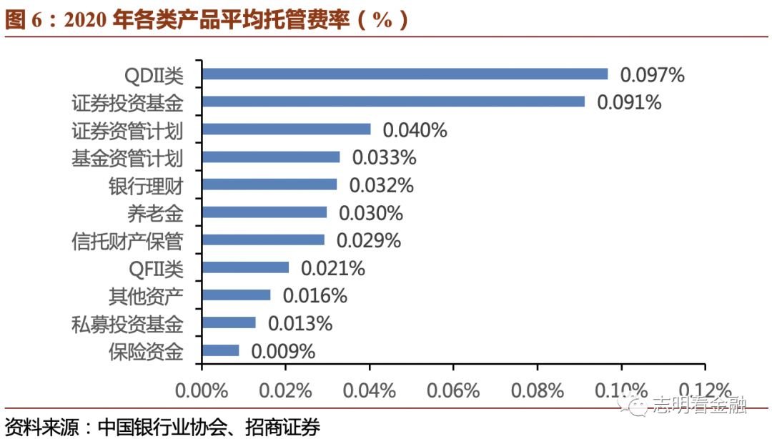 从平均托管费率来看,不同产品托管费率差异较明显。2020年QDII和证券投资基金托管费率显著高于其他品类,对于QDII类产品,由于涉及到双托管人,境内/境外托管银行都会收取托管费,托管费率较高;对于证券投资基金产品,公募基金对托管银行估值运营、投资监督、信息披露等服务的要求相对其他业务更高,因此费率相对较高。