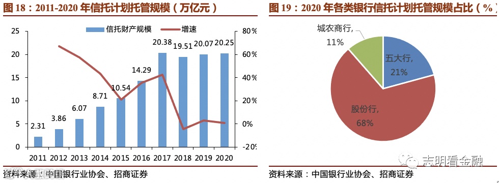 稳步发展阶段(2017-至今):2017年银监会出台了全面开展“监管套利、空转套利、关联套利”专项治理工作的通知,遏制各种通道业务发展。随着“去嵌套”、“降杠杆”、“强穿透”的逐步推进,通道业务退潮,资产托管业务进入到平稳增长阶段,2017-2019年托管规模增速降至个位数。2020年托管规模增速略有加快,同比增速达10%。我们认为,一是得益于2020年股市较好;二是资管新规的边际影响有所减弱。