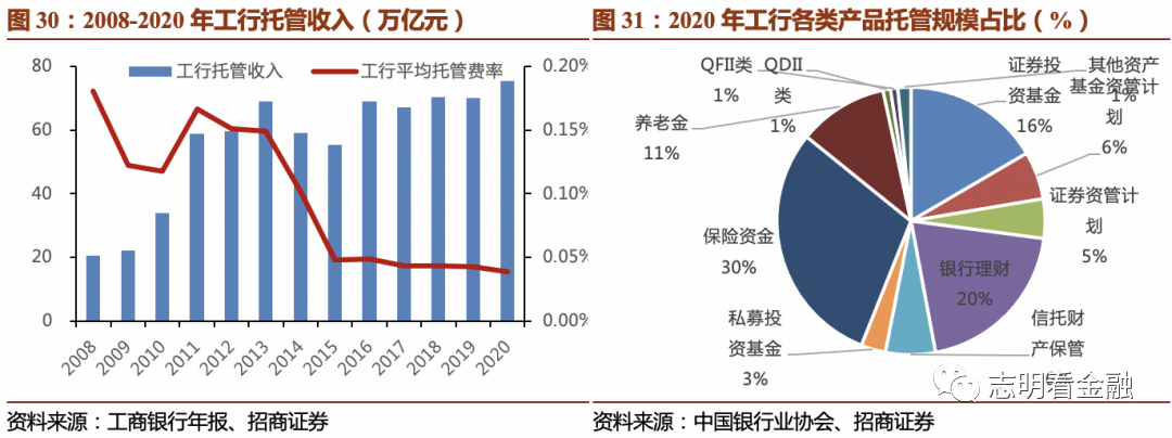 工商银行作为托管业务领头羊,议价力更强/结构更优,托管费率高于行业平均水平,凭借代销优势/智慧托管系统/全球化布局,有望继续保持行业龙头地位。