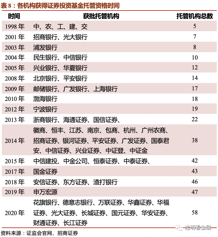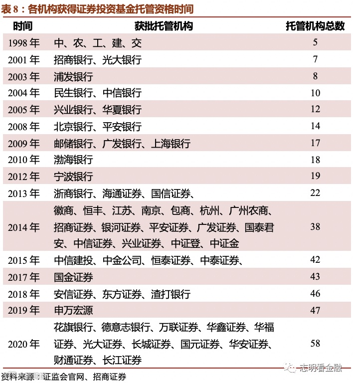托管机构不断多元化,趋势有望延续。受准入限制,2013年之前,只有商业银行拥有证券投资基金托管资格。随着托管牌照的逐渐放开,2013年后多家证券公司相继获批开展托管业务。2020年中国证监会和中国银保监会联合修订发布了《证券投资基金托管业务管理办法》,允许外国银行在华分行申请证券投资基金托管业务资格。目前花旗银行托管牌照已于2020年9月获批,德意志银行托管牌照于2020年12月获批,汇丰银行也已申请托管牌照,托管机构多元化的趋势有望延续。