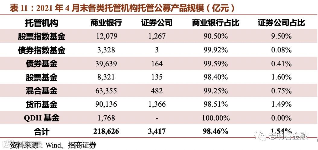 在公募证券投资基金托管中,商业银行占有绝对优势。截至2021年4月末,证券投资基金规模22.2万亿元,其中,券商托管规模为3417亿元,占比仅1.54%,商业银行托管占比98.46%。商业银行近乎垄断,主要由于商业银行有先发优势、代销优势、投资优势(商业银行自营资金可投资货币型基金/债券型基金,商业银行理财资金可投资各类基金)。券商仅在股票指数基金中,占比略高,达9.5%,主要由于指数证券投资基金一般在场内交易,券商的客户可直接通过券商三方存管账户进行购买。