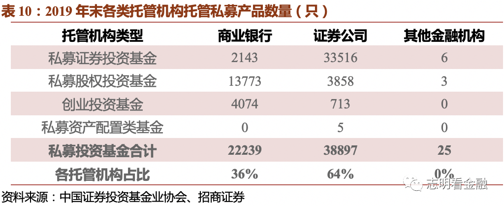 在私募托管业务中,银行考虑到声誉风险较为谨慎,但券商更注重私募证券投资基金带来的PB业务发展,在私募业务托管业务中较为积极。券商以托管服务为基础核心业务,提供投研服务/融资融券/做市/基金孵化等一系列增值服务,构建为私募客户提供一揽子全方位解决方案的PB综合托管服务体系。因此,券商在私募业务上相较银行更有优势。据证券投资基金业协会数据,截至2019年末,券商/银行托管私募基金产品数量占比分别为64%/36%。