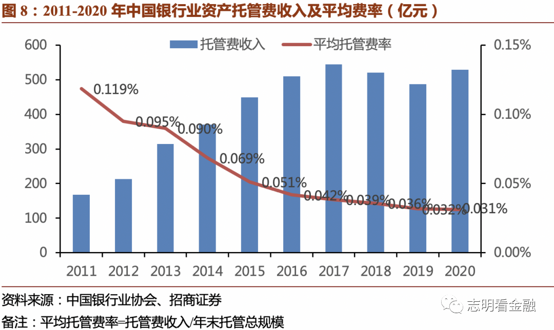 行业竞争加剧使得托管费率逐年下降。由于托管业务同质化,且行业玩家数量持续增加,竞争加剧,导致平均托管费率逐年下降。据中国银行业协会,我国平均托管费率从2011年的0.119%下降至2020年的0.031%。