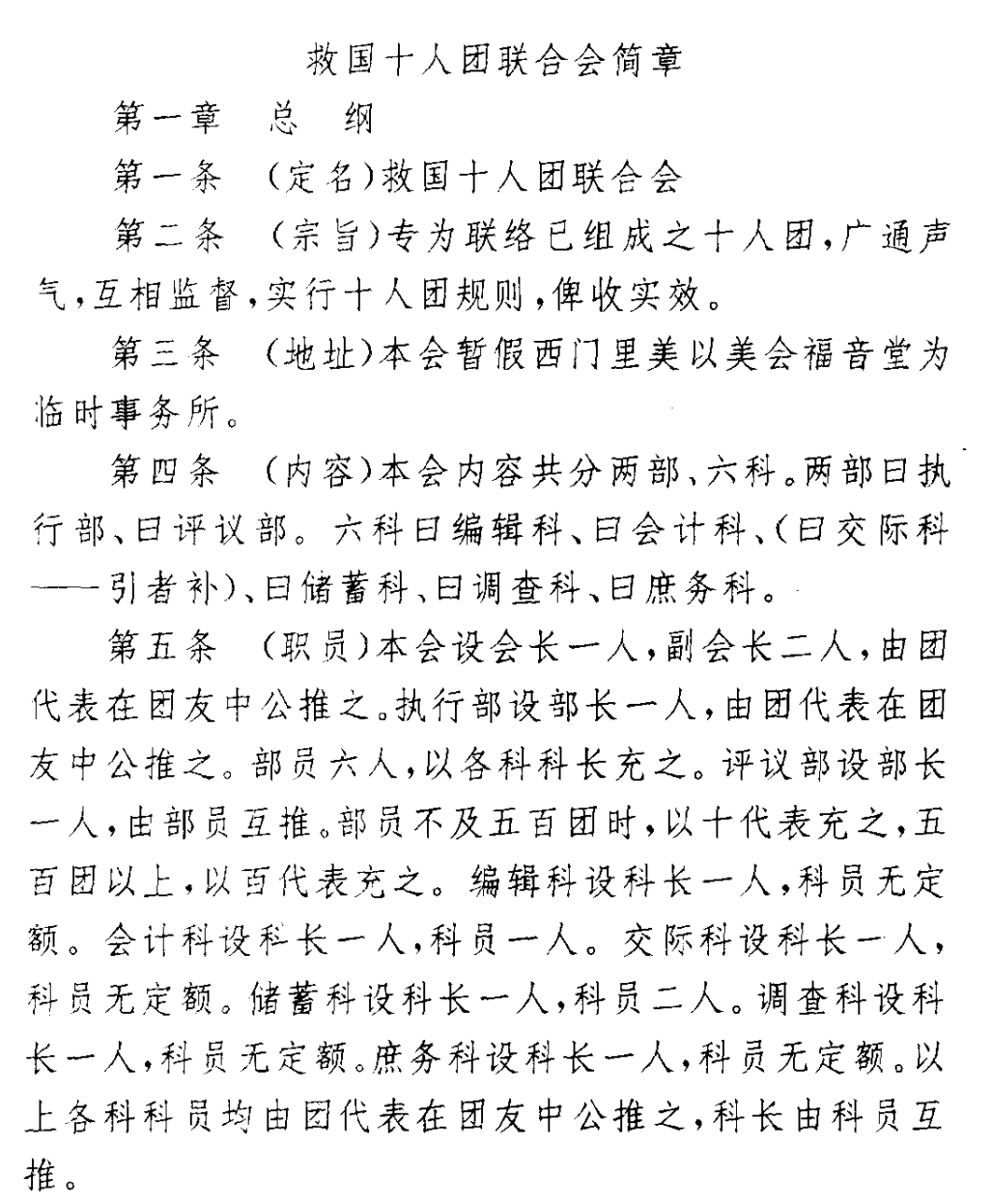 天津“十人团”以抵制日货、储金救国为宗旨,成员主要是工人和店员,也包括学生、商人和社会各界人士。有严密的组织规则,以“团”为基本单位,10人为一团,每团推举一名“团代表”,每10个团推举一名“十代表”,以此类推,每一百团、一千团推举“百代表”“千代表”,代表佩戴各色徽章。团内设两部六科,即:执行部、评议部、编辑科、会计科、储蓄科、调查科、庶务科。会长、副会长由团代表公推产生。成员持盖章的名卡证明身份,卡背面注明其余9位团友的姓名。团员对外有宣介义务,每人至少动员10人加入,均要以人格和生命担保,履行包括提倡国货、不买日货、不用日币、不张贴日商广告、不在日资银行存款等义务。团员之间互相监督,如有违反罚洋十元,若有非法行为或借会招摇、故意破坏等举动,将勒令出团,言明加入组织“系出于良心上之发动”“决非儿戏之事”,要严格遵守组织规章。