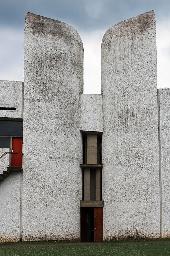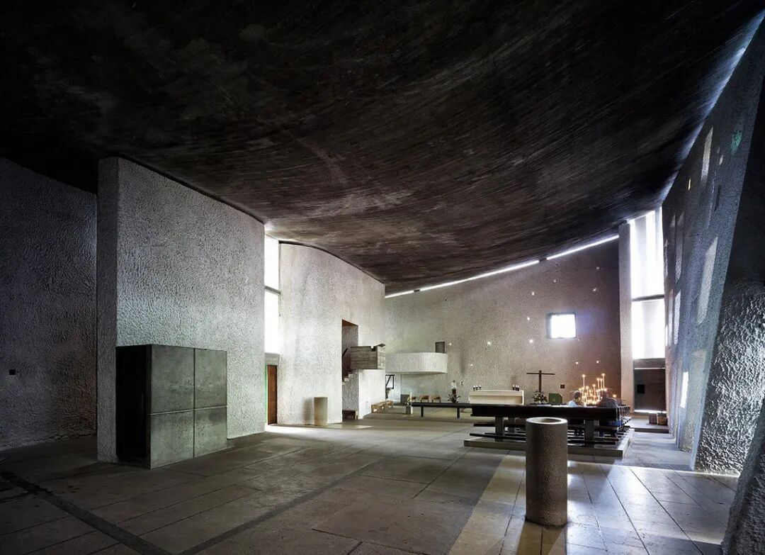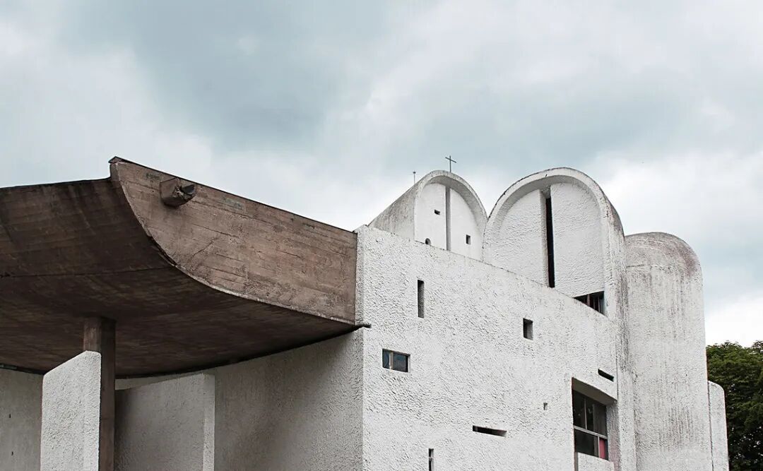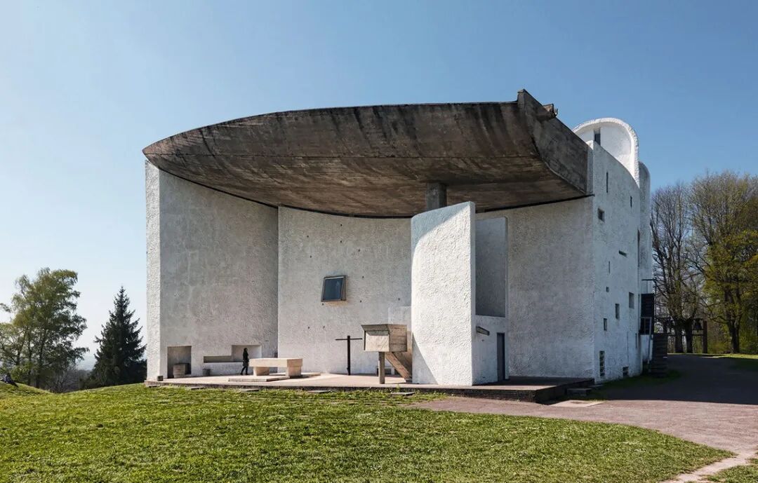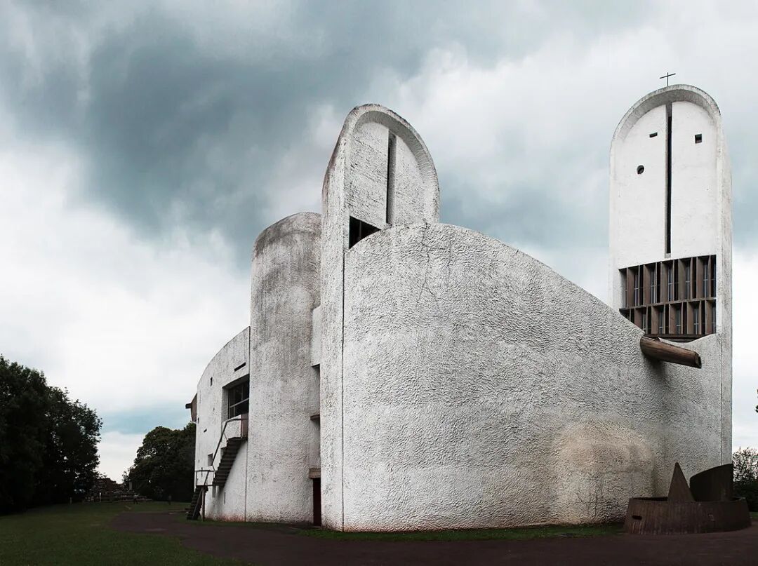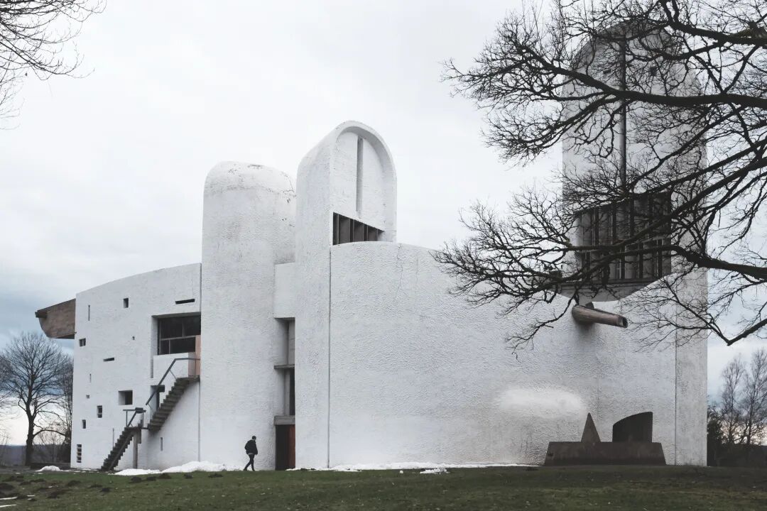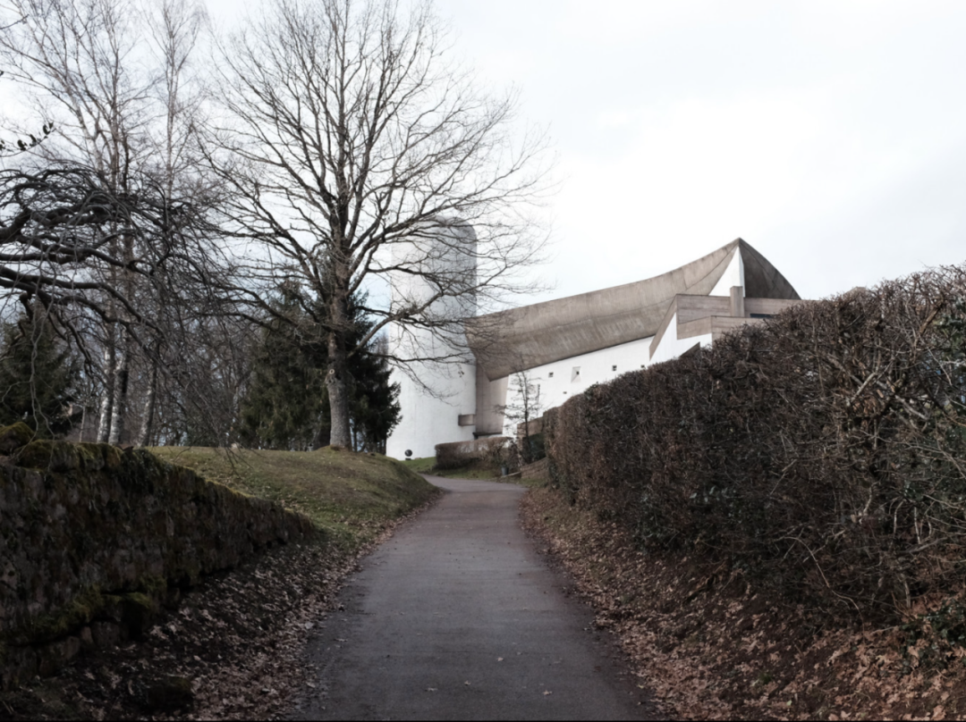 朗香教堂坐落于瑞士边界的山林中,修建在一座拆除的教堂旧址上。勒·柯布西耶希望在此以简洁的现代设计创造一种精神体验。隐秘的场地环境,赋予其独特的气质。