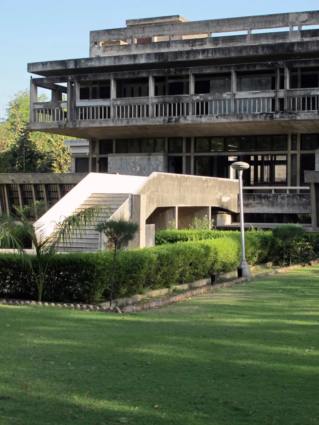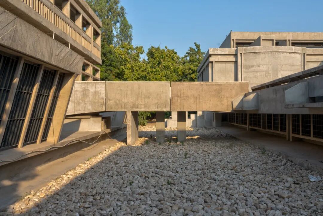 其建筑设计理念将现代主义原则与当地气候、材料和社会背景相结合。建筑形式遵循极简主义,采用方正的大体量,反映了现代主义建筑的秩序。在空间布局上,设计从古代印度寺庙建筑中汲取灵感,保留当地传统建筑特征。中央庭院作为不同区域间的连接与过渡,从空间的转换中构建一场精神之旅。