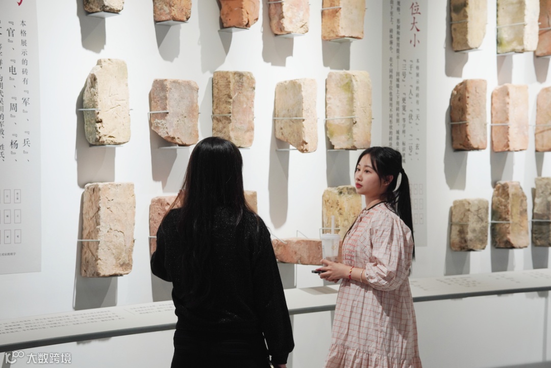 步入吴阳客厅二层展厅,近百块铭文古砖、隋唐水纹陶器等珍贵文物,与铜质吴阳规划地图古今呼应。古砖上有坊都村落、参与界别、方位大小、质量验收等参与筑城的文字与符号标识。